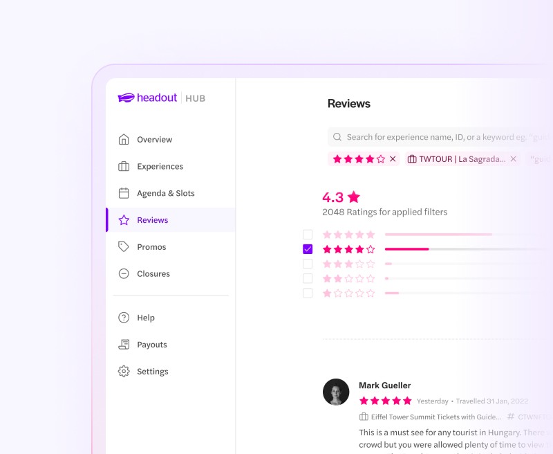 Check out how guests rated your experiences, scan through our detailed reports, see real-time bookings and dashboards.